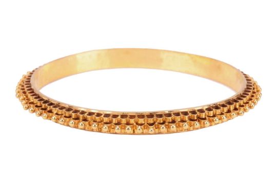 A closed bangle, decorated with tiered fluting borders and bead details, yellow metal unmarked surface testing as 14ct, inner diameter 6.1 cm, 19.86 grams.