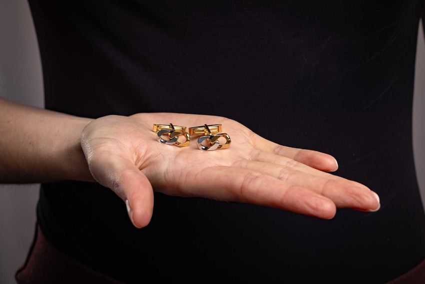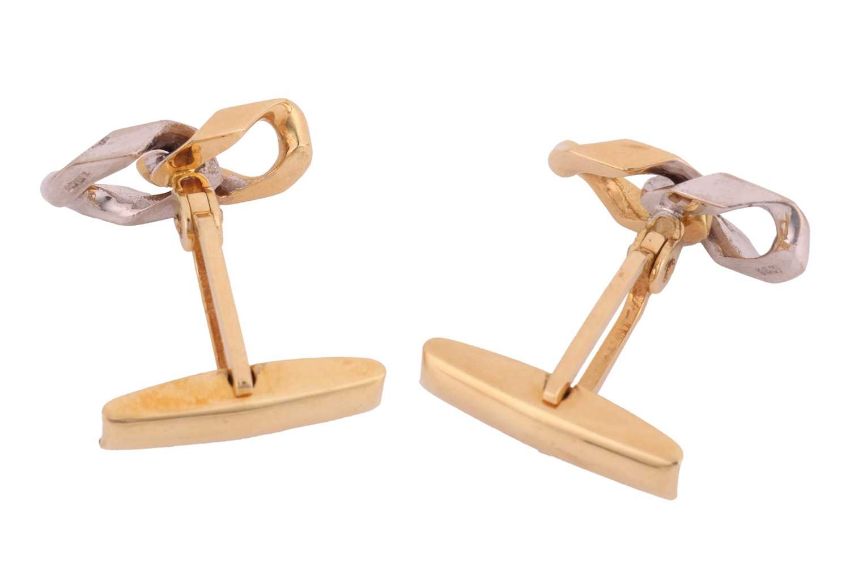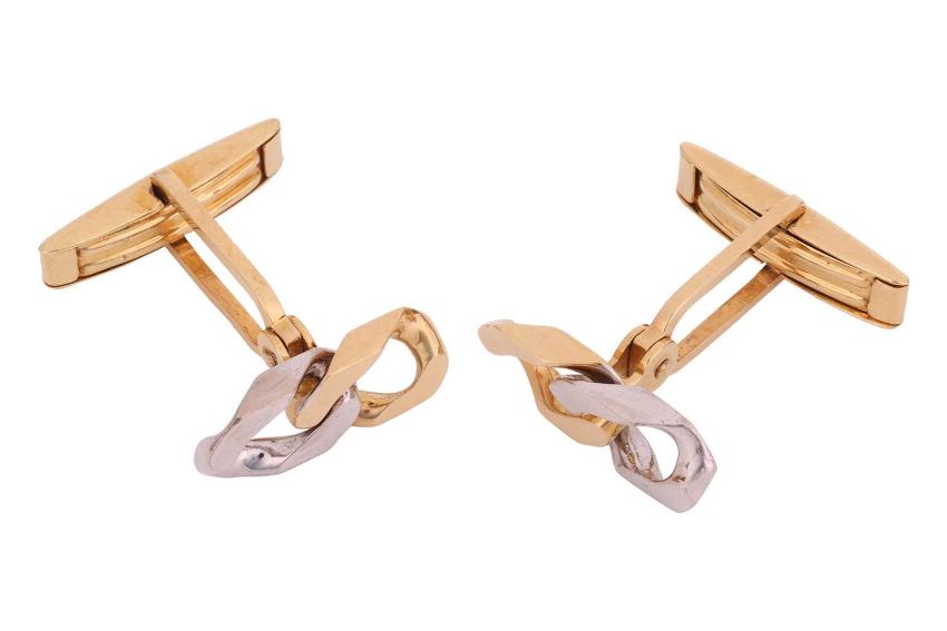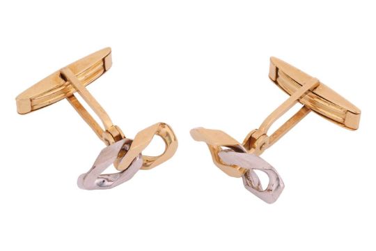 A pair of two-toned curb link cufflinks, each consisting of bi-coloured flat curb links, with toggle fittings to the back, stamped '18ct', 10.97grams.