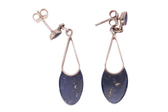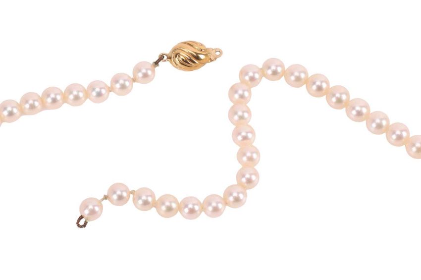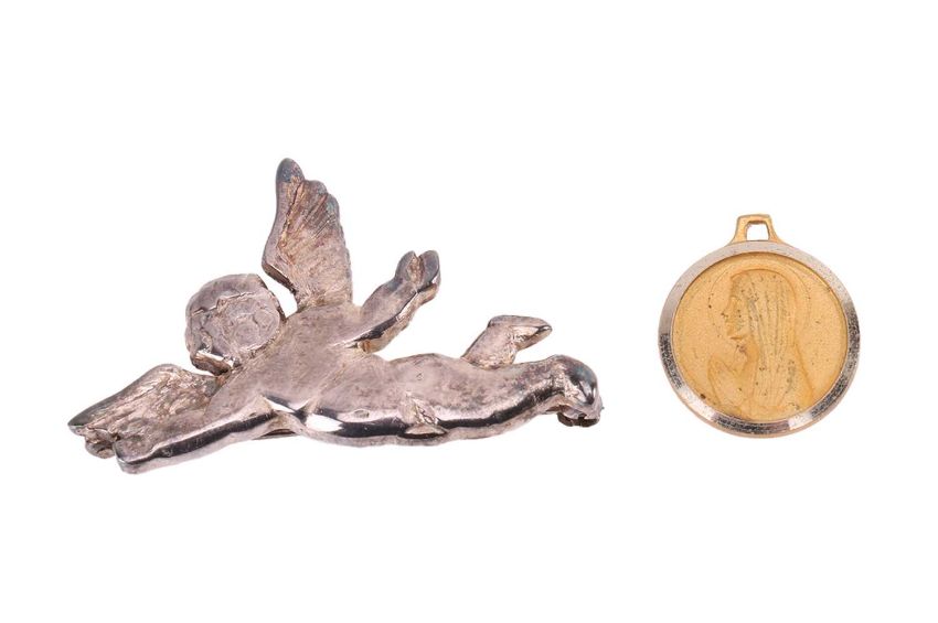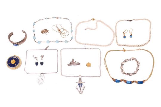 A collection of jewellery items, to include a cultured Akoya pearl necklace, featuring pearls of approximately 5.5 to 6.0 mm, with creamy body colour and silver-pink lustre, strung to an ovoid tongue clasp (string broken) in yellow metal stamped "750", a Charles Rennie Mackintosh oval pendant on chain, a silver cherub brooch, a white metal open cuff bangle set with a blue ceramic cabochon, a pendant and earrings in white metal set with lapis, together with various other items of costume jewellery and a folding travel clock, total weighable 69.5 grams.