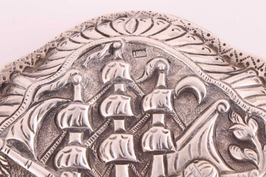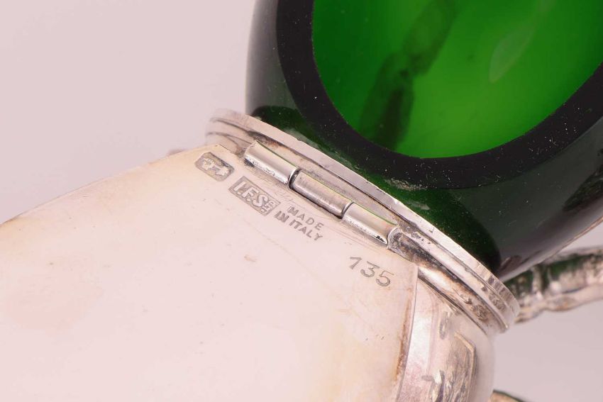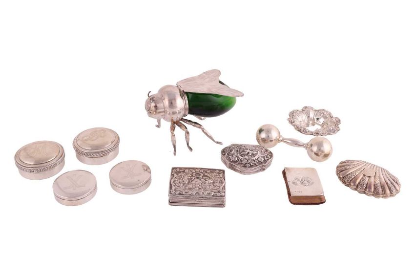 A contemporary Italian silver-plated novelty "Bee" honey pot with bottle green glass body and articulated cover formed as the insect's wings, 16 cm long x 10 cm deep x 9.25 cm high. Together with an 18th-century Ottoman "clam shell" form silver snuff with chased rococo bird and full-masted sailing ship design, 7.5 cm long x 5.4 cm deep, together with another Ottoman double-sided silver snuff and other small Greek and other silver boxes and small items of silver, 15.8 ozt, 494 grams gross weight of weighable silver.