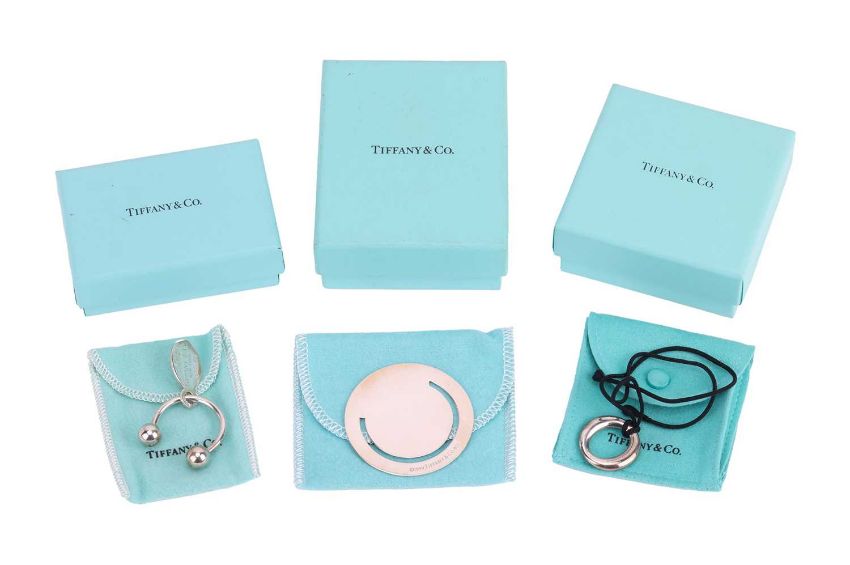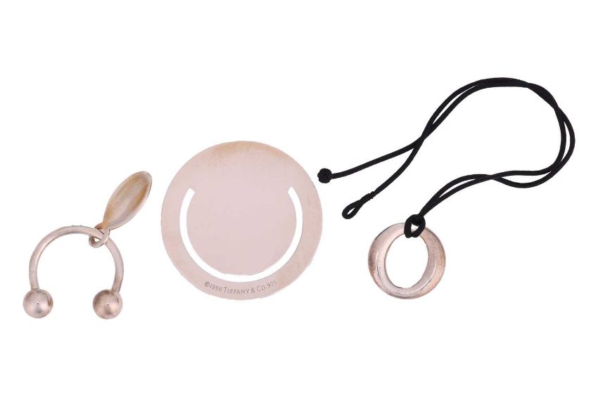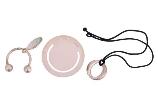 Tiffany & Co. - A group of silver items to include an Elsa Peretti for Tiffany "Sevillana" pendant on cord, a circular bookmark and a keyring with tag charm, all signed Tiffany, with associated pouches and boxes, total weight of items 30.5 grams (3).