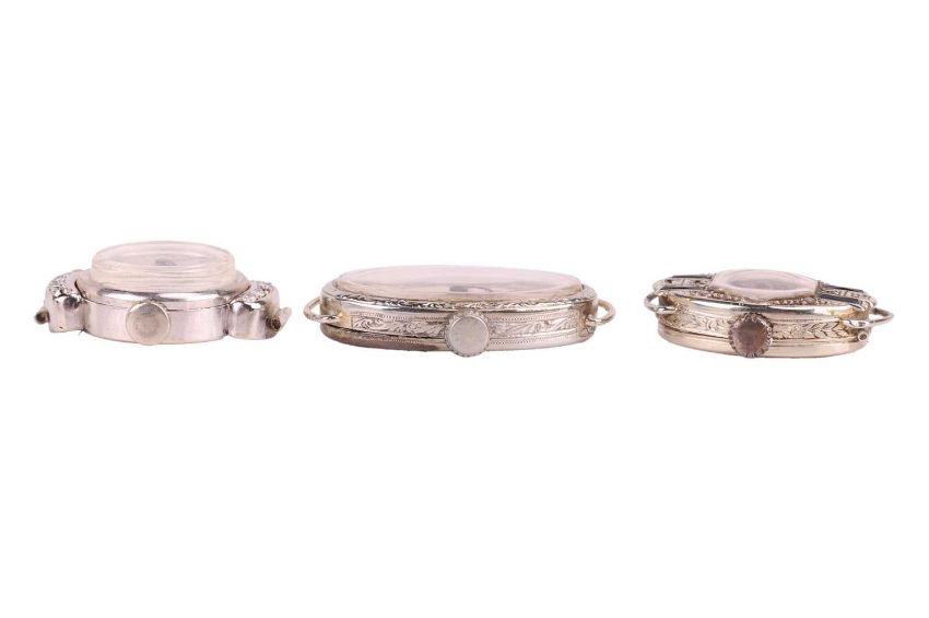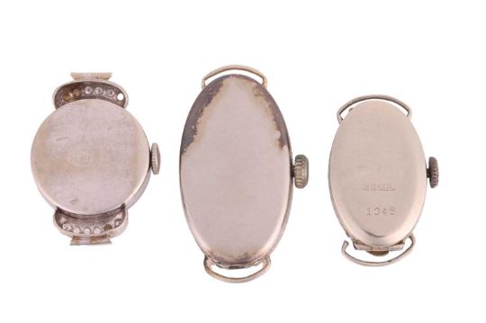 Three Dress Watches; The first a colourless sapphire-set watch, in a round white metal case stamped '0.585' to the reverse, case measuring 16mm, with white dial and blued pointed baton hands, strap deficient; The second a Rolex engraved dress watch, the oval case measuring 15mm x 25mm, with white dial stamped 'Rolex', with a Rolex 15-jewel manual wind movement, in a white metal case stamped '18K' internally, strap deficient; The third an 18ct white gold gem-set dress watch, the oval case measuring 12mm x 21mm, featuring a jewelled manual wind movement, strap deficient. Total weight of items 24.0 grams (3).