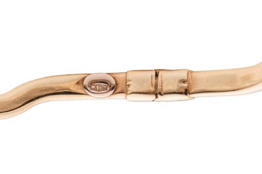 A hinged oval bangle of undulating design, with tongue clasp and safety catch, in polished yellow metal stamped "375", width 3mm, inner diameter 6.5cm, 6.2 grams.
