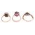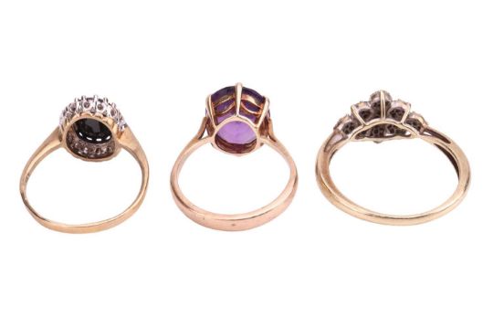 A single stone oval amethyst dress ring, together with a sapphire and diamond oval cluster ring and a diamond cluster ring. All in unmarked mounts, surface testing as 9 carat gold. Gross weight 7.9 grams.