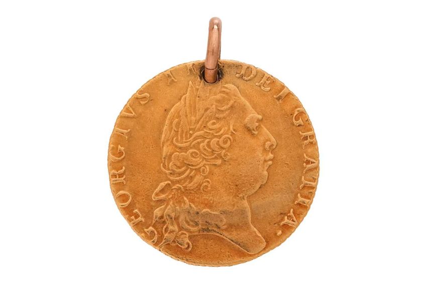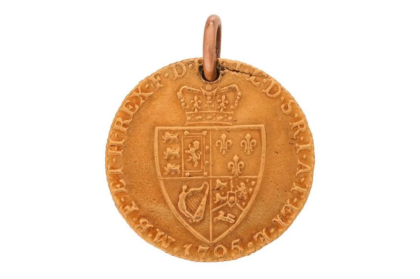 A George III Guinea, dated 1795, pierced with a pendant ring, gross weight 8.6g.