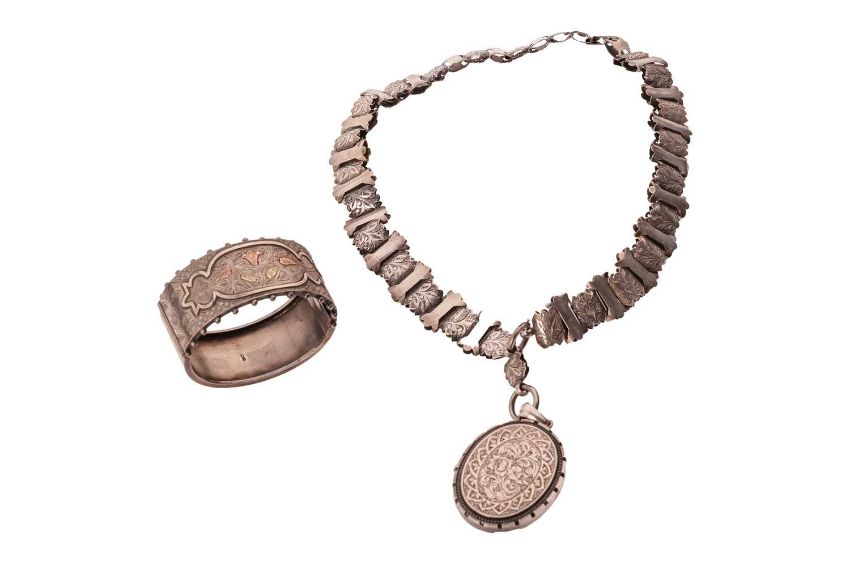 A Victorian silver necklace and bangle. The oval locket with foliate detail, opening to reveal a glazed compartment, suspended from a fancy link-chain alternating polished bars and foliate links, mounted in presumed silver, together with a bangle with foliate detail and of tri-coloured design, highlighted by beading to the edges, to a slide-in depress clasp, mounted in presumed silver, locket dimensions 6cm x 3.7cm, chain length 53cm, bangle inner diameter 5.5cm, width 3cm, gross weight 101.86grs (2)