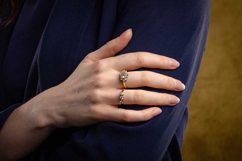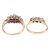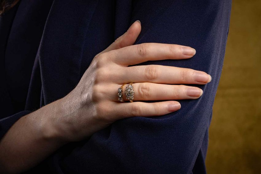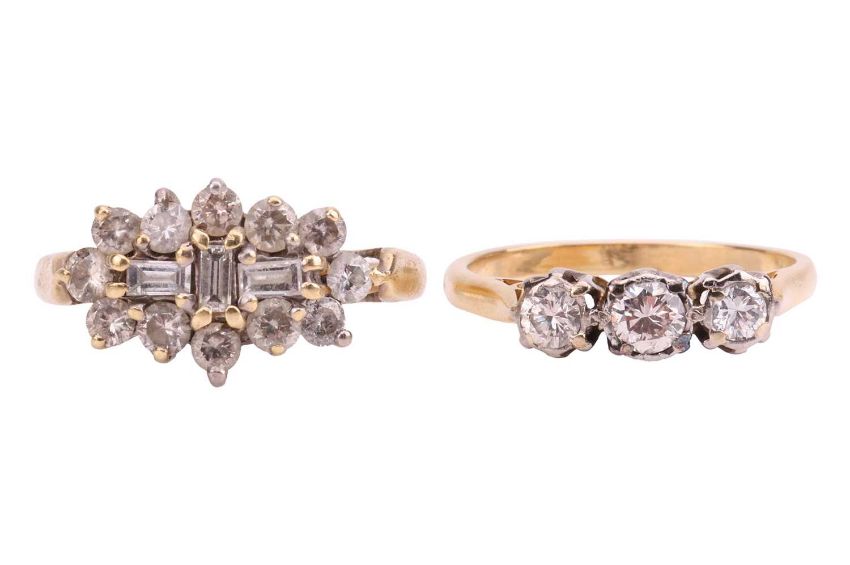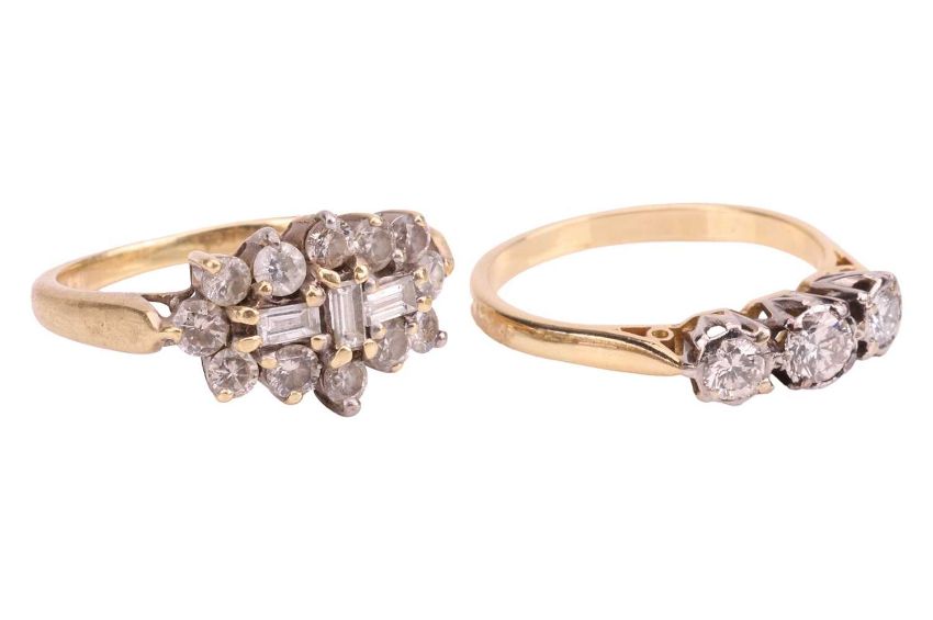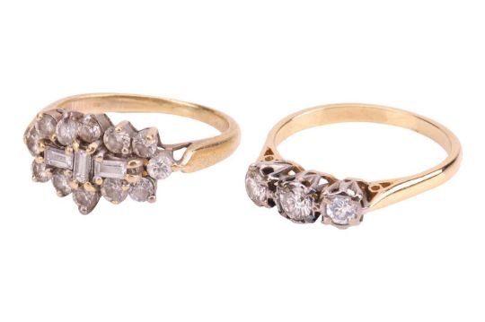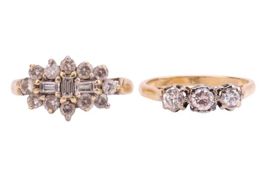 Two rings, comprising a diamond cluster ring, set with baguette-cut and round brilliant diamonds, in a yellow metal mount stamped ‘18K’, size M1/2, together with a trilogy diamond ring, set with three round brilliant diamonds, with an estimated total carat weight of 0.38ct, to a bi-colour metal mount surface tested as 18ct, size L; 6.4 grams (2)