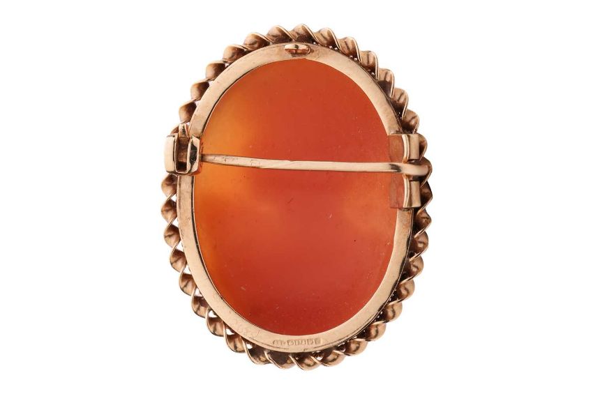 A 9ct Cameo Brooch, featuring the bust of a woman in profile, to a yellow gold mount with twisted wire border and hinged-pin fitting and jump ring to reverse, with British hallmarks for 9ct, 3.0 x 2.3 cm, 5.2 grams.