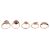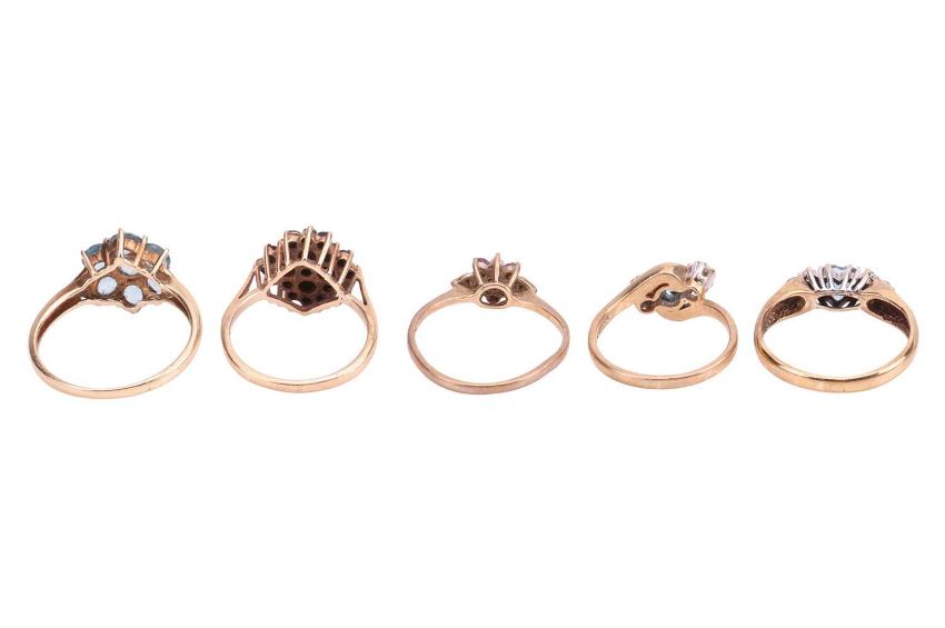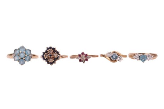 Five rings; comprising a 9ct gold sapphire and diamond floral cluster ring, size M, a blue topaz floral cluster ring, in a yellow metal mount marked ‘9K’, size Q, a heart-cut blue topaz and diamond-set ring, to a 9ct gold mount, size N, a blue topaz and diamond crossover ring, to a 9ct gold mount, size K1/2, and a ruby and diamond-set floral ring, with one stone deficit, to a 9ct gold mount, size N1/2; gross weight 11.6 grams (5).