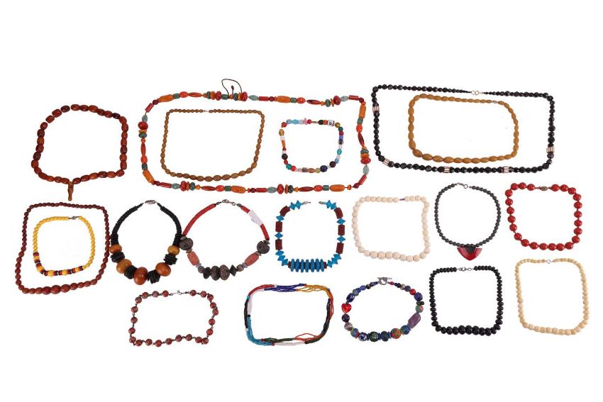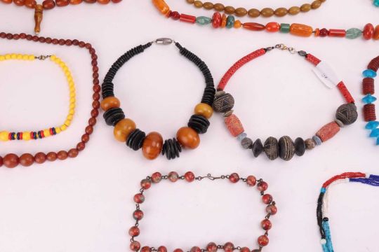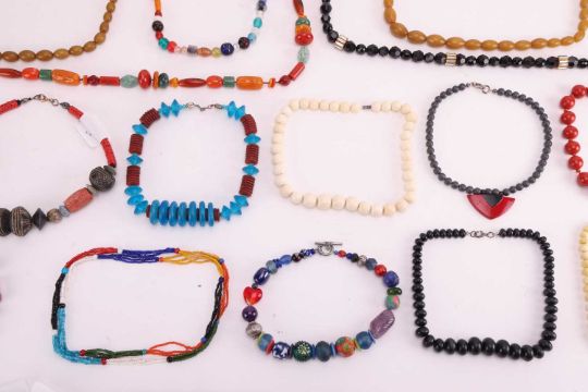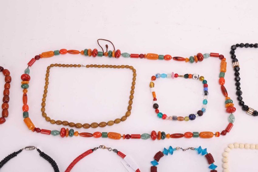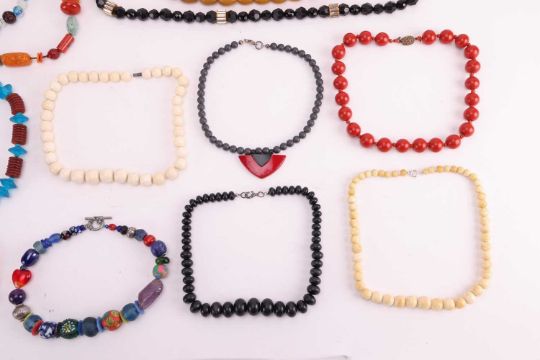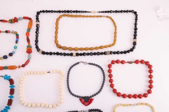 A large group of beaded necklaces, to include a "Berber" pressed-amber bead necklace, another pressed-amber necklace, a ceramic bead necklace featuring blue and red coral (heliopora coerulea and corallium rubrum and ecklonia maximavarious) together with various other examples featuring glass, hardstones, resin, bone, wooden and plastic beads, with gilt and white metal clasps, total weight 1423.4 grams.
