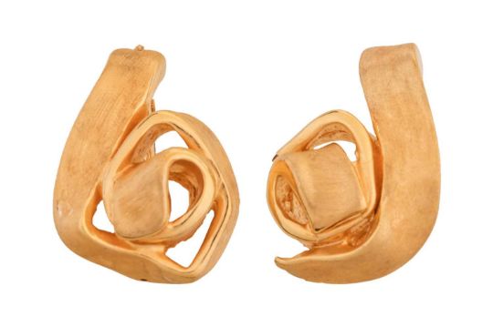 A pendant and a pair of drop earrings, in the form of an abstract hollow rosette in brushed finish, hinged creole fittings, yellow metal struck with Italian assay marks for 18ct, 4.0 cm drop for the earring; total weight of items 16.0 grams. (2)