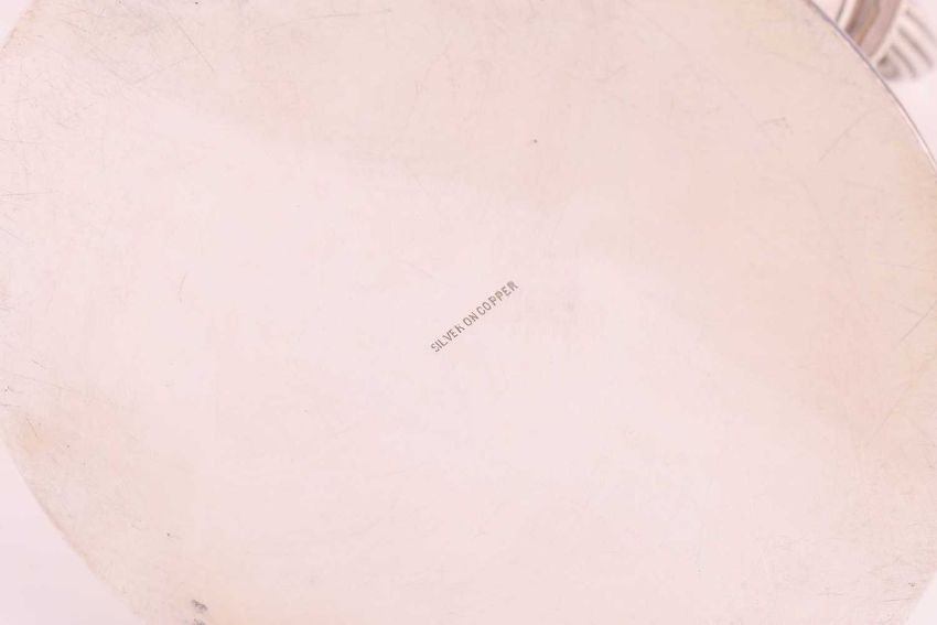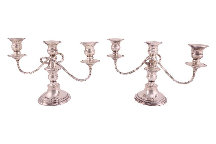 A pair of 20th-century three-sconce silver on copper candelabra on spreading beaded bases. 30 cm wide.
