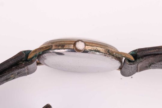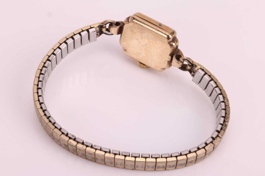 A group of watches and pocket watches; The first a 9ct gold Omega, reference 50967, serial 560962, the 15mm x 15mm case enclosing a silvered dial with gilt Arabic and Baton numerals, Omega calibre 244 17-jewel manual wind movement numbered '13088979', not running and wound tight, to an after-market gold-plated elasticated strap, 18.0 grams; The second a Broadwest gold-plated watch, reference 472745, the 30mm case enclosing a silvered dial wityh Arabic numerals, with seconds subsidiary dial at six o'clock, 15-jewel manual wind movement, currently running, to a black leather strap and gold-platyed buckle 27.0 grams; The third an Elgin white metal open face pocket watch, the 58mm case enclosing a white dial with black Roman numerals, with seconds subsidiary dial at six o'clock, keyless wound movement, currently running, 157.0 grams; The fourth a white metal open face pocket watch, the 58mm case enclosing a white dial with black Roman numerals, with seconds subsidiary dial at six o'clock, case back engraved with 'Ex.B.R. L.N.E.R. 3445 Ex.B.R.' keyless wound movement, currently running, 121.5 grams; A white metal Albert chain, with T Bar, completed at each end with lobster clasps, measuring 44.0cm in length, 20.5 grams.