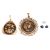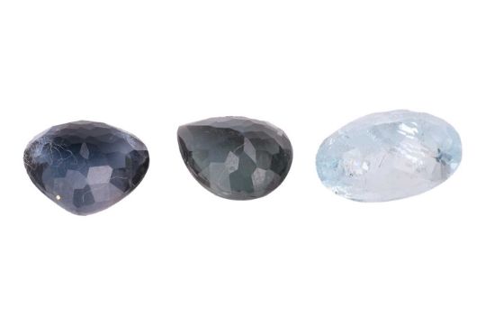 A small group of jewellery items; To include two gold-plated Damascene pendants, each featuring foliate details and scrolled engraving, as well as two loose faceted indicolites (dark blue tourmaline, one greenish, another purplish) and a loose faceted pale blue tourmaline.