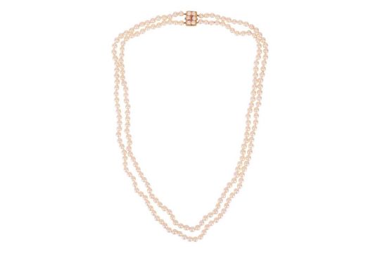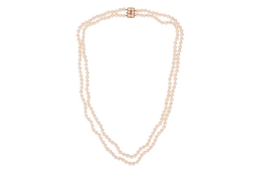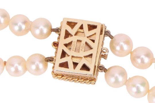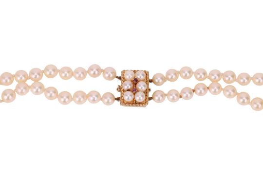A double row cultured pearl necklace with 9ct gold clasp, comprising two rows of round cultured pearls, approximately 6.5mm, hand-knotted to a rectangular box clasp embellished with pearl and ruby accents, British hallmarks, overall length 68.0cm, 76.5 grams.