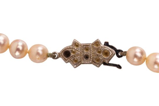 An early 20th century single-strand cultured pearl necklace, comprising a row of hand-knotted round pearls, in graduated sizes from 5.5 - 8.9mm, completed with a fishhook clasp in the form of a bow, embellishment deficient, in white metal marked ‘925’, overall length 45.0 cm, 27.0 grams.