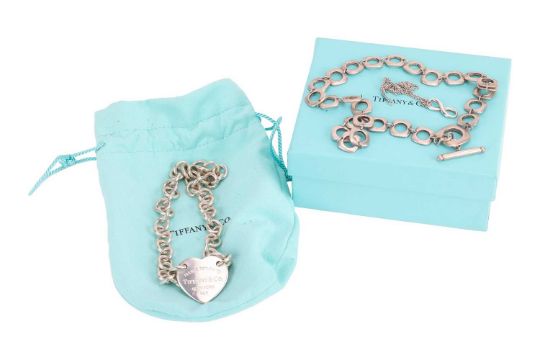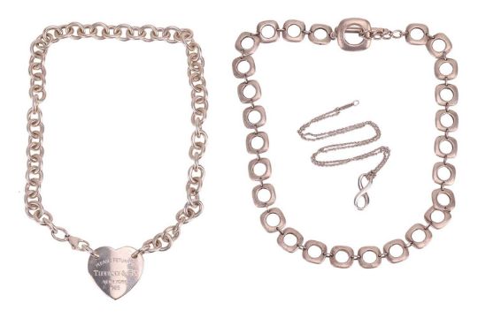 Tiffany & Co. - three necklaces comprising a silver cushion-shaped open link necklace with toggle clasp, a large Return to Tiffany heart necklace, with lobster clasp, hallmarked silver, and an infinity pendant on chain, clasp broken; all necklaces with maker’s marks, with branded box and pouch; 118.0 grams (3)
