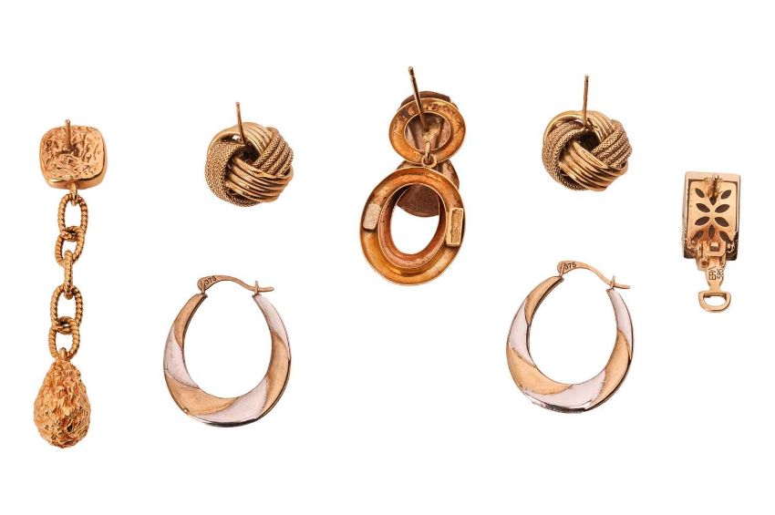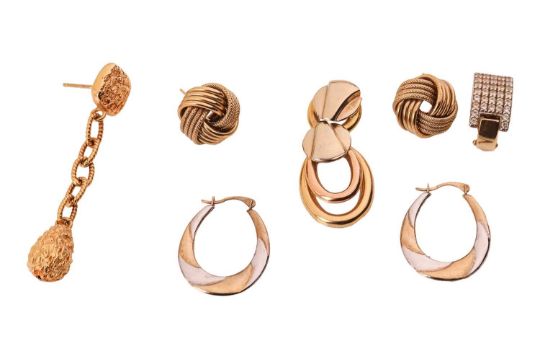 A small group of jewellery; comprising a pair of knot earrings, in yellow metal with post fittings (butterfly backs deficient), surface testing as 14ct; A pair of bi-colour oval hoop earrings, stamped ‘375’; And three loose earrings, stamped ‘585’ ‘750’ and ‘750’; Total weight of items 11.4 grams (5).