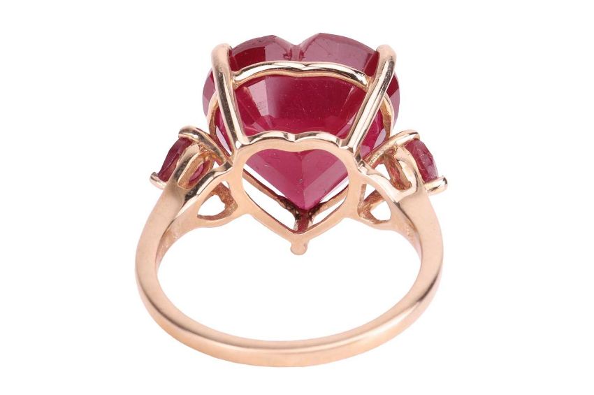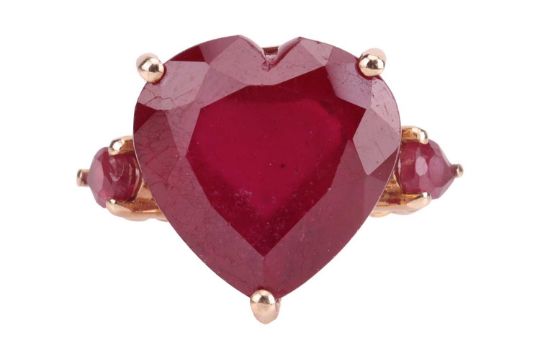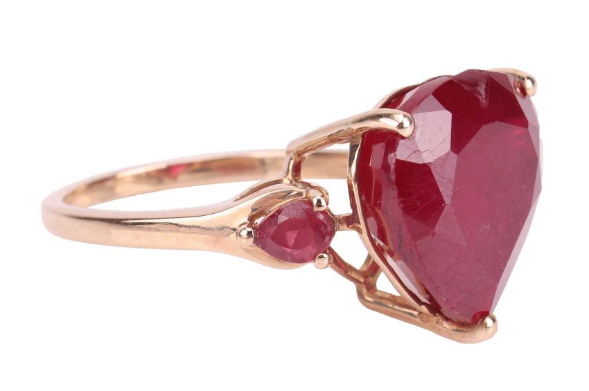 A ruby ring, the heart-shaped glass-filled ruby, flanked by pear-shaped rubies, mounted in 9ct yellow gold, stamped 375, 9K, Birmingham assay mark, ring size L, gross weight 4.7grs