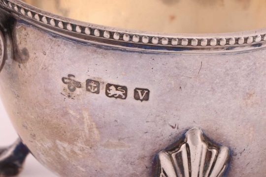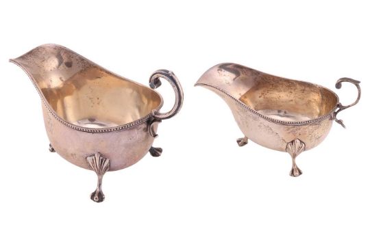 A silver sauce boat, with beaded border, flying double scroll handle and on three ball and claw feet; Birmingham 1920, together with another sauce boat, smaller, Birmingham 1921. Gross weight 10.1ozt, 316 grams