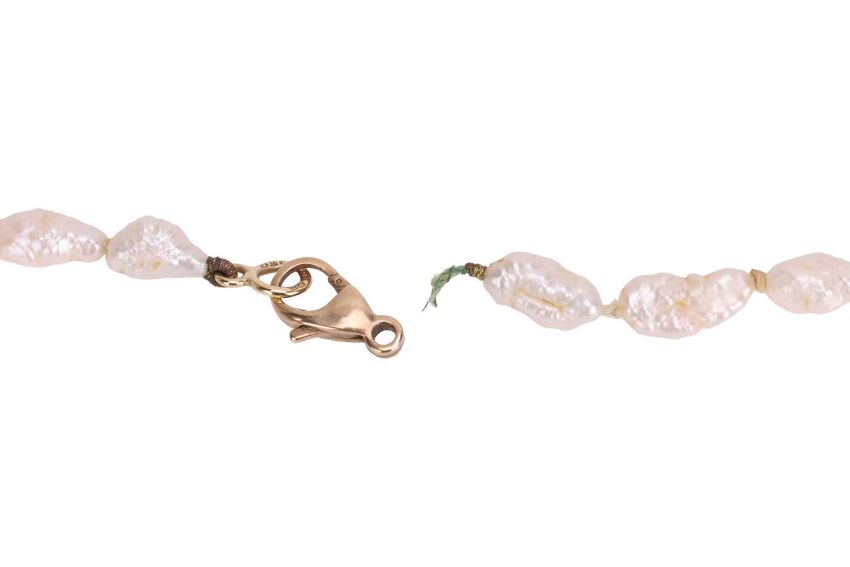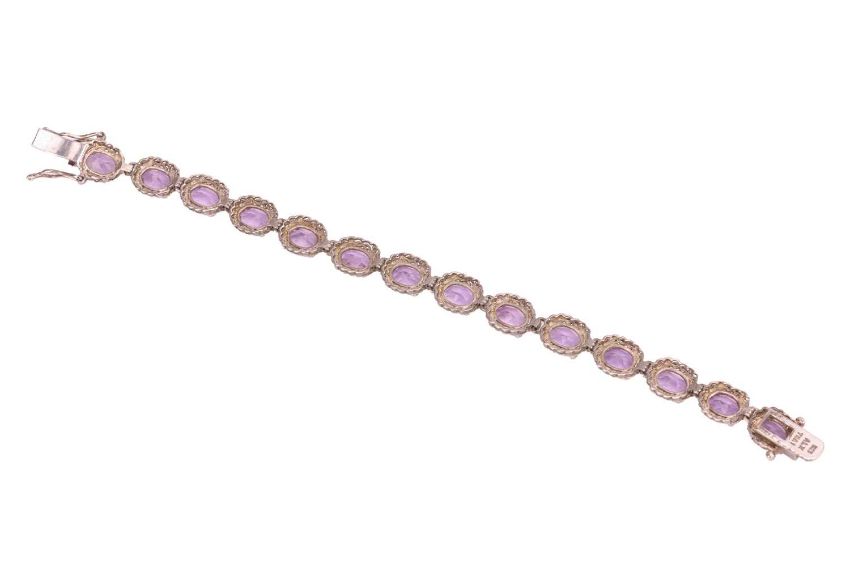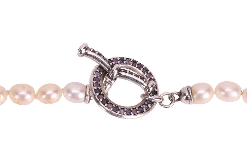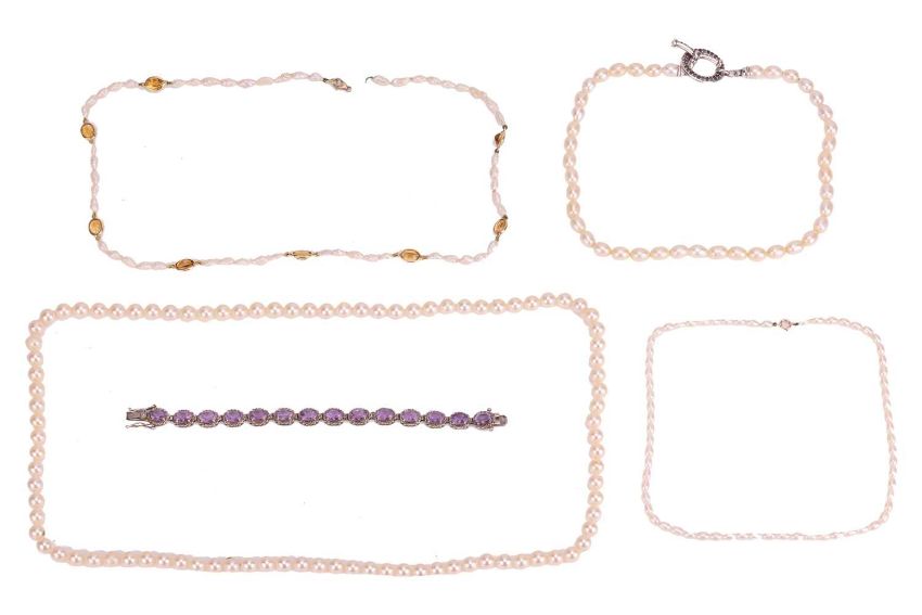 A group of jewellery items, to include; A single strand cultured pearl necklace, 72.0cm in length; A cultured pearl necklace, featuring oval cultured pearls and completed with a yellow metal spring ring clasp stamped ‘375’, 41.0cm in length; A keshi pearl and citrine necklace, featuring rows of five keshi pearls interspersed by collet-set oval-shaped citrines, with a 9ct lobster clasp (strand broken); A cultured pearl necklace, featuring a single row of oval cultured pearls, completed with a silver toggle grain-set with round-cut amethysts of varying hues of purple, 42.0cm in length; An amethyst line bracelet, comprising fourteen oval-cut amethysts in claw settings with twisted wire border, the articulated links in white metal and completed with an integral box clasp and two additional safety catches, 16.5cm in length.