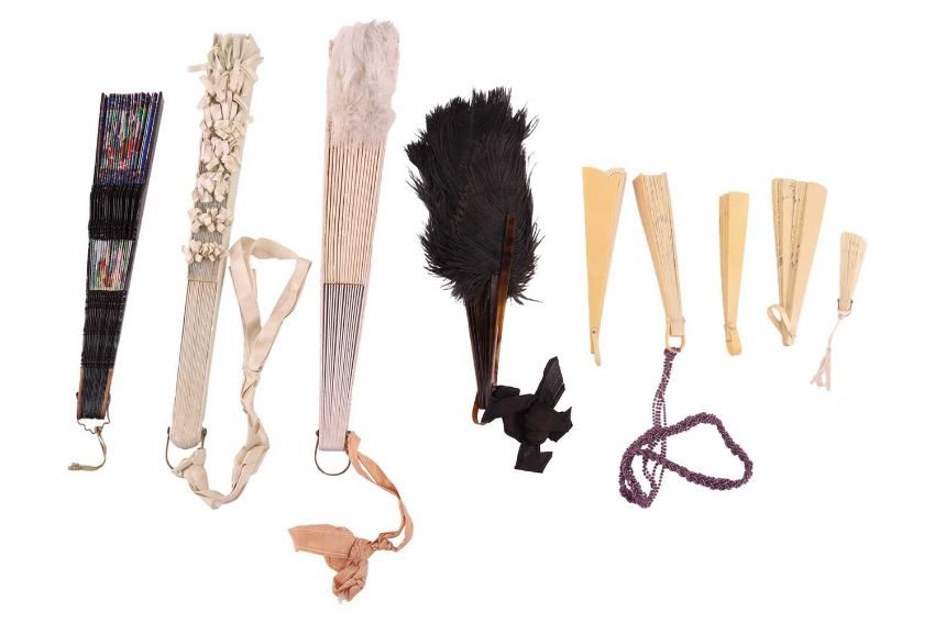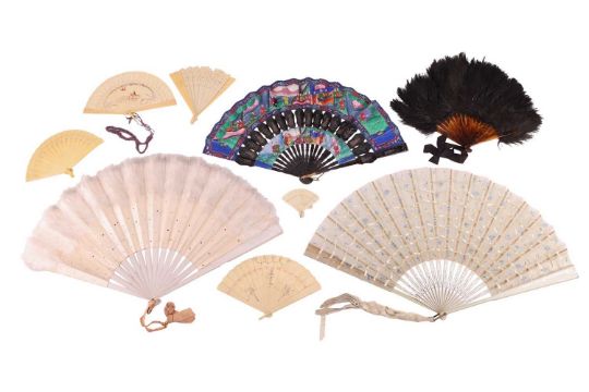 A group of costume jewellery and other items; to include beaded necklaces, featuring a cinnabar lacquer example, imitation amber examples and others, as well as enamelled, hardstone and resin bangles, enamelled and gem-set brooches, along with pendants, cufflinks, bracelets, a micromosaic snuff box, and nine decorative fans of varying sizes and design.