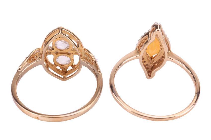 A pair of gem-set rings, each of marquise-shape, one set with a marquise-cut opal within a round-cut synthetic colourless sapphire surround, the other centrally-set with circular rose-cut synthetic colourless sapphires highlighted by round-cut synthetic colourless sapphires, mounted in 9ct yellow gold, Birmingham assay mark, ring sizes P 1/2 and O 3/4, gross weight 4.5 grams. (2).