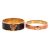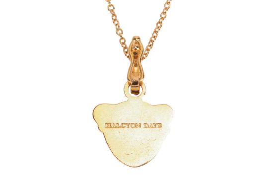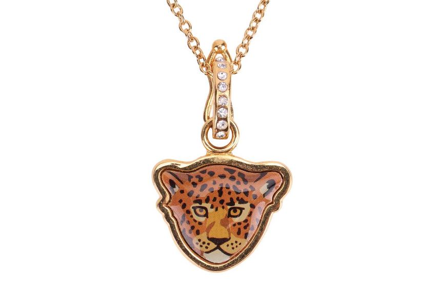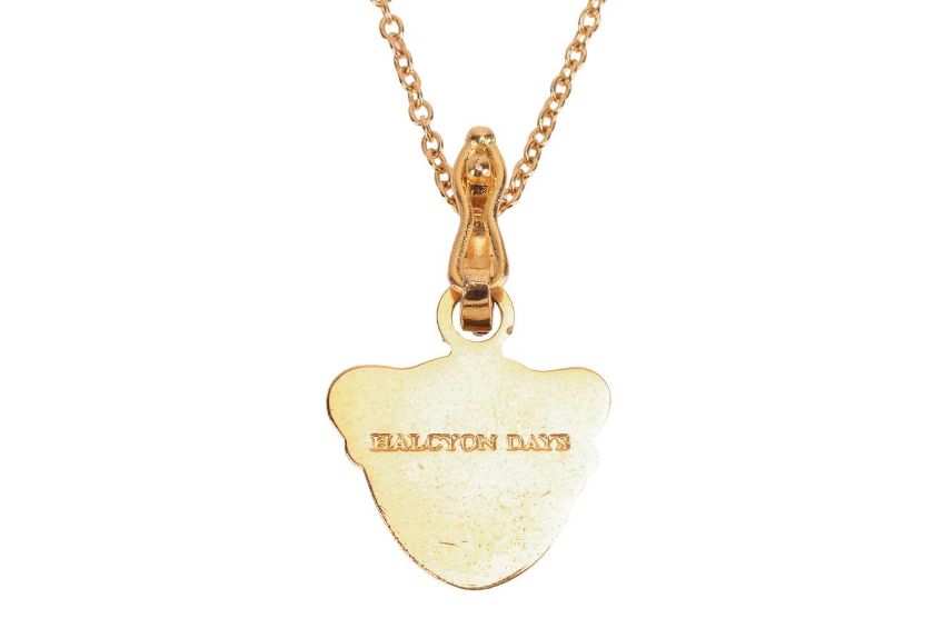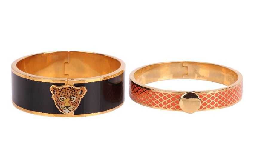 A collection of two enamel bangles and a pendant necklace by Halcyon Days, the Salamander bangle with orange and golden enamel, the Magnificent Leopard Head bangle with black and golden enamel, together with a multi-coloured leopard's head pendant with detachable colourless paste suspensory loop, to a cable-link chain with lobster clasp, all signed, mounted in plated 18ct yellow gold, with a box and a pouch, width 10mm and19mm, diameters 6cm, pendant length 3cm, chain length 51cm, gross weight 11.08 grams (3)