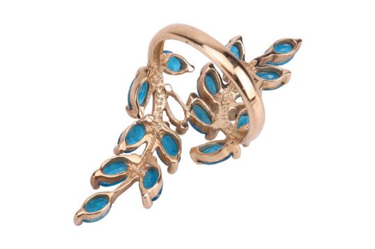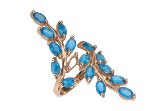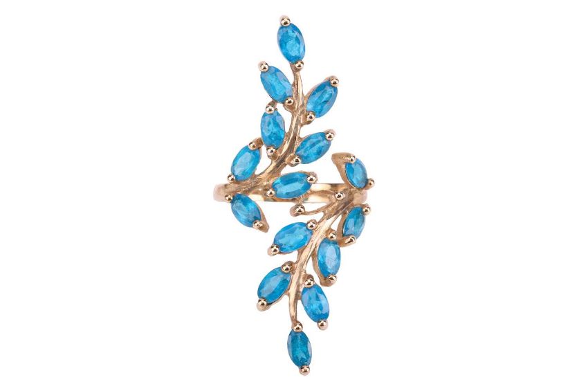 An apatite dress ring, of foliate design, each navette-cut apatite within a two-claw setting, one deficient, mounted in 9ct yellow gold, stamped with maker's mark R&C, partial Birmingham assay mark, ring size L, gross weight 5.3 grams.