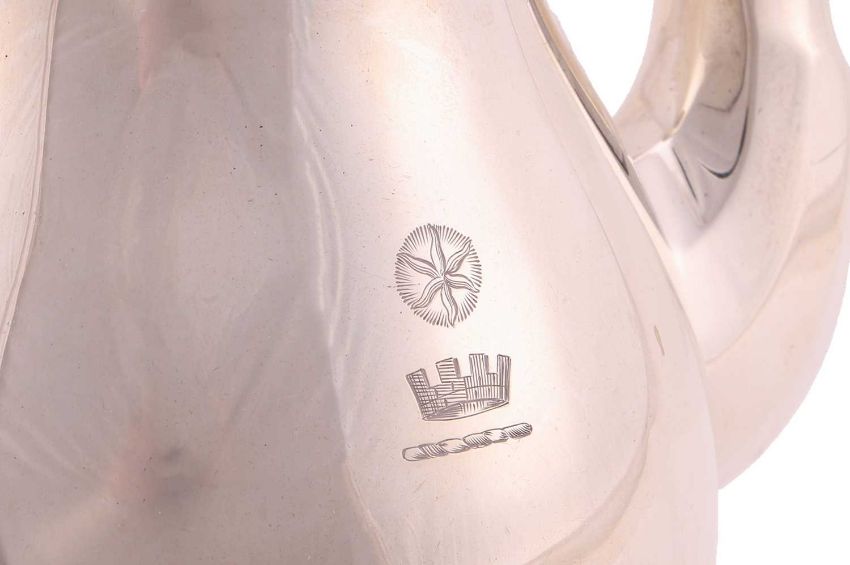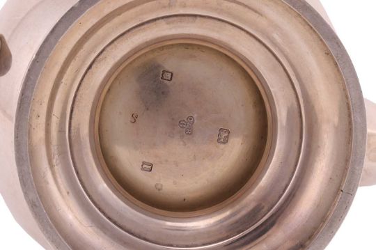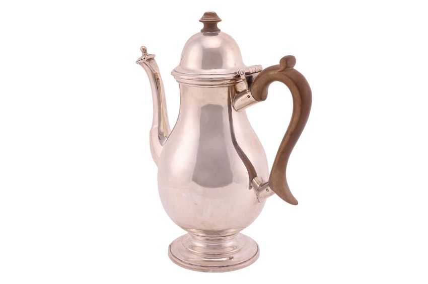 A silver coffee pot in George III style; baluster form with domed, hinged cover and panelled spout with hinged cover. Fruit wood handle and finial. London 1926 by Charles and Richard Comyns. 23cm high. Gross weight 601.0 grams. (19.32ozt)