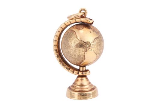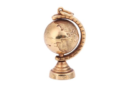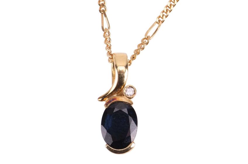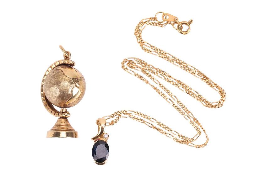 A sapphire and diamond pendant in yellow metal mount testing as 18ct, on a 9ct gold Figaro link chain; together with a 9ct gold globe charm, with a spinning sphere and suspension loop, British assay marks, 3.0 cm; total weight of items 7.1 grams. (2)