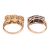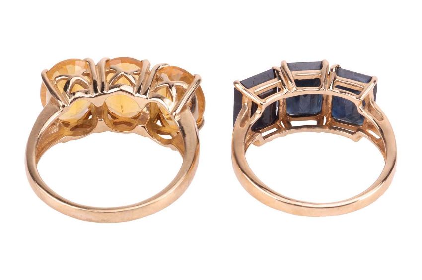 A pair of gem-set rings, the first claw-set with three oval-shaped fire opals, the second claw-set with three rectangular-cut sapphires, to pierced bifurcated shoulders, both set in 9ct yellow gold, stamped with Birmingham assay mark, rings zies N and L, gross weight 7.2 grams (2)