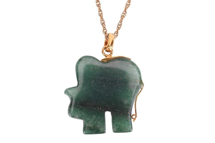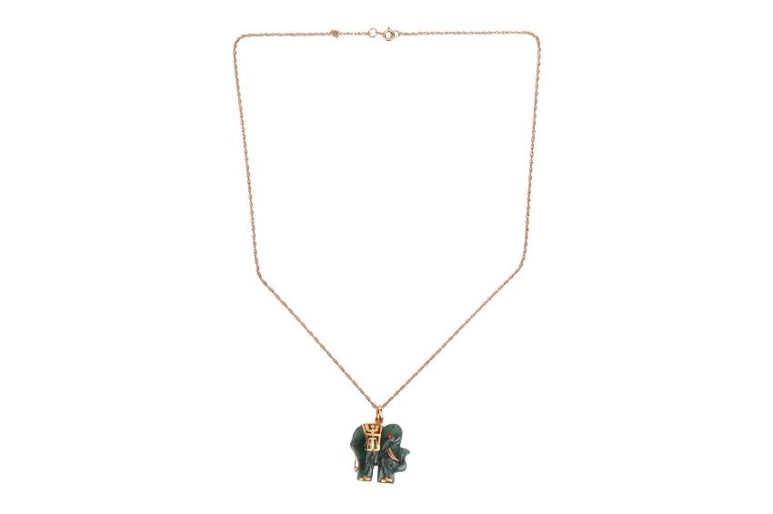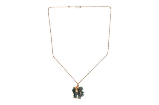 An elephant pendant on chain, the dyed quartzite carved as a stylised elephant with rhinestone eye, 3.0 cm drop including loop bail, on a 49.0 cm long loose twisted rope link chain with spring-ring clasp, British assay marks for 9ct gold, weighable 2.0 grams.