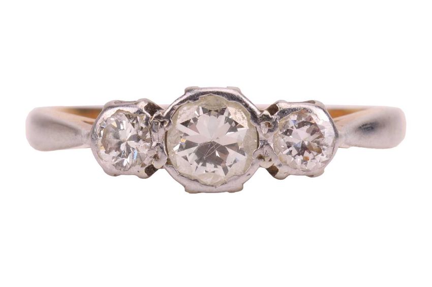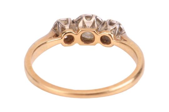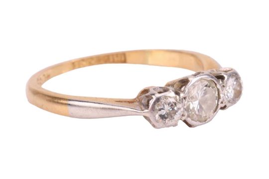 A diamond trilogy ring, with an estimated total diamond weight of 0.40ct, comprising three graduated round brilliant-cut diamonds in illusion settings, between tapered shoulders leading to D-profile shank, in metal stamped ‘Pt&18ct’, size J½, 1.8 grams.