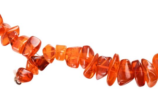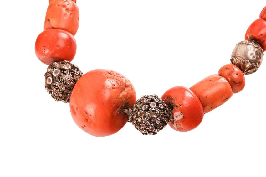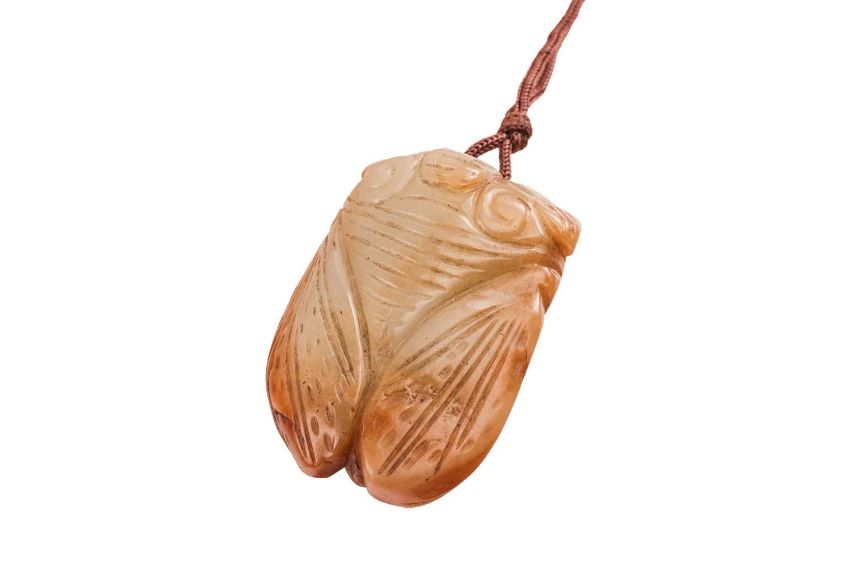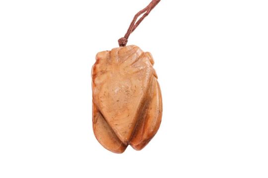 A mixed group of jewellery items comprising an amber bead necklace, a coral and white metal necklace, a carved Chinese jade cicada pendant, a necklace featuring white metal frog and tortoise charms, a bronze torc-style bangle, and a Thai coin; 302.9 grams