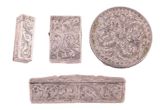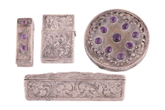 A set of continental dressing table items, with scroll and floral engraving, including a comb, a lighter, a compact mirror and a lipstick case. The compact with '800' mark and the compact and lipstick set with amethysts. Gross weight 6.5ozt, 205 grams