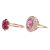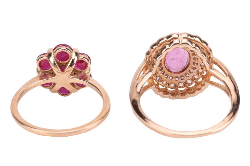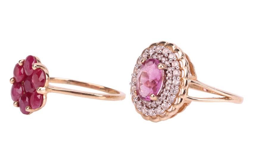 Two rings; the first centrally-set with an oval mixed-cut pink fluorite, surrounded by white sapphires, to a 9ct gold mount, size O, together with a floral-style ring, set with seven fracture-filled rubies, in a 9ct gold mount, size L1/2; 6.2 grams (2)