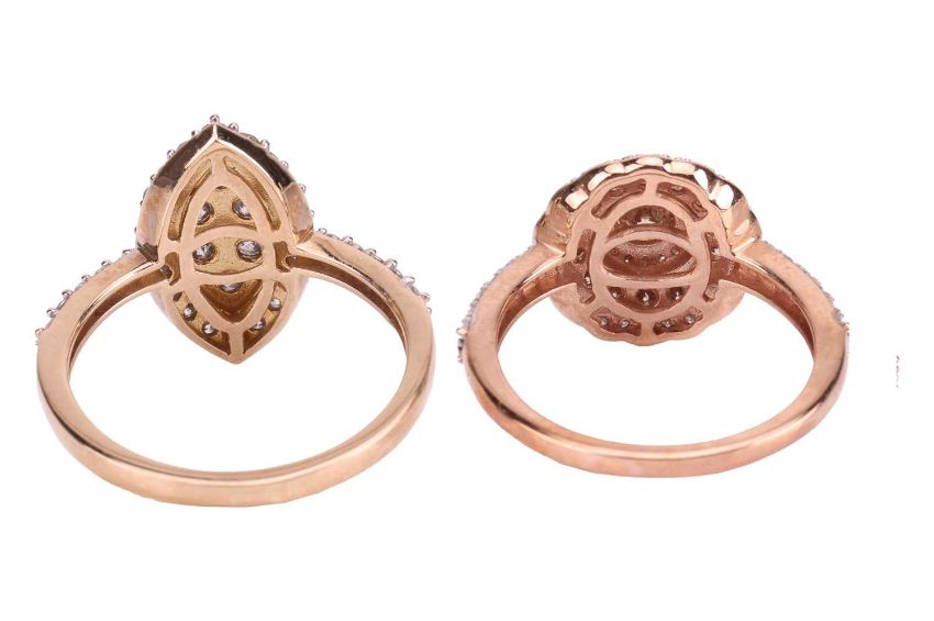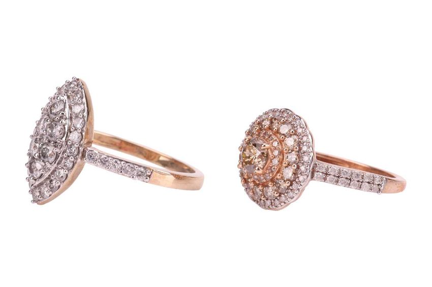 Two diamond-set rings; The first a marquise-shaped diamond-set ring, the central marquise-shaped panel grain-set with six round brilliant-cut diamonds, encircled by a row of twenty grain-set round brilliant-cut diamonds, to diamond-set shoulders and a rose metal ring shank marked ‘9K’, ring size P ½, 3.2 grams; The second a coloured diamond ring, featuring a central round brilliant-cut diamond of brown colour, claw-set in rose metal and encircled by three rows of graduating round brilliant-cut diamond of varying tones from colourless to brown, to diamond-set shoulders, in rose metal stamped ‘9K’, ring size M ½, .9 grams. (2).
