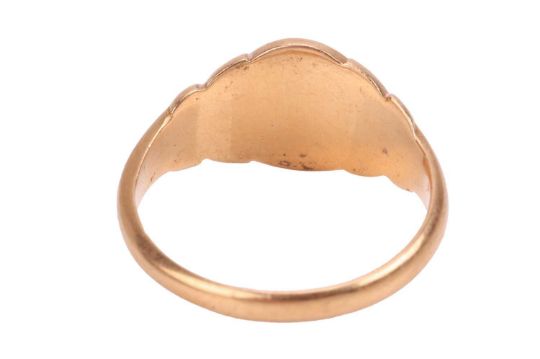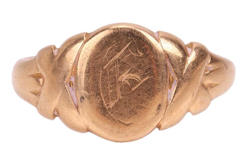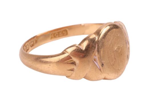 A signet ring in 18ct yellow gold, the oval head engraved with a monogram, between shoulders in cross lashing design, to a tapering D-profile shank, British assay marks, size K, 4.0 grams.