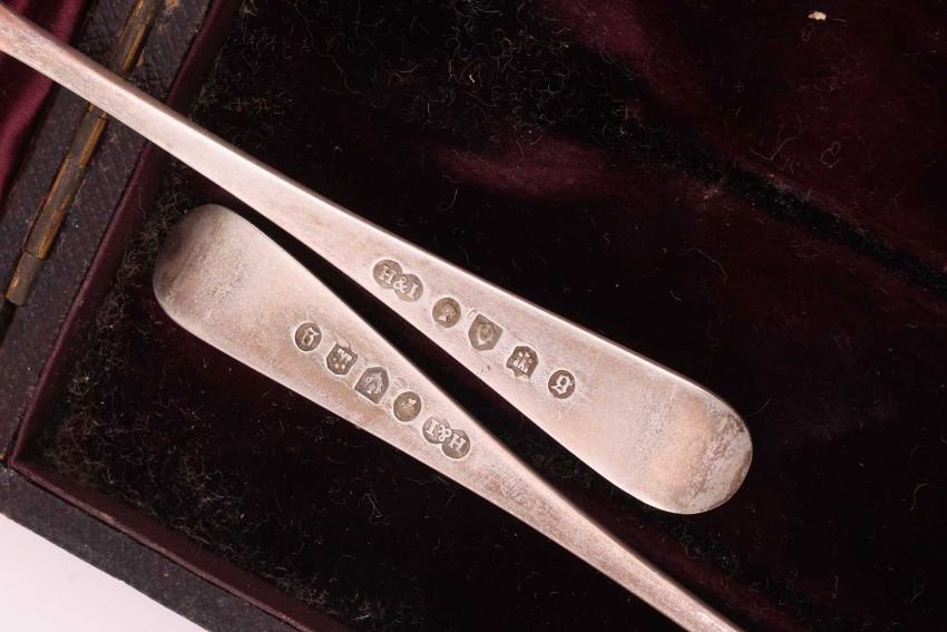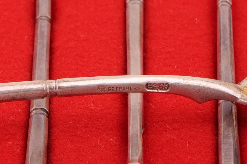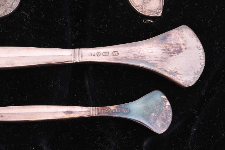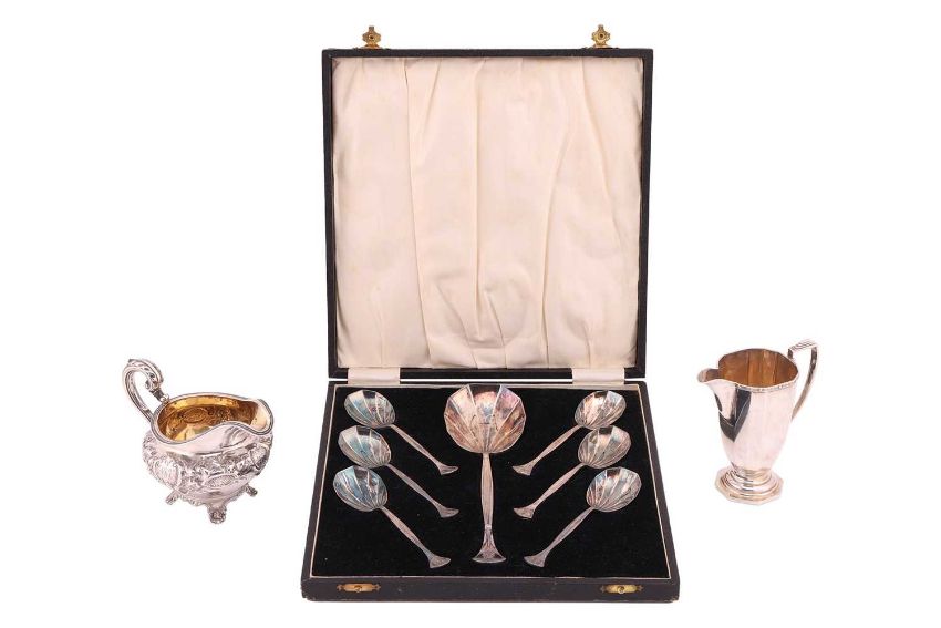 A Russian case of twelve condiment spoons by Grachev Brothers, with tapered bamboo handles and fig-shaped bowls, 84 zolotnik, 13.8 cm long, in original fitted case; a Victorian case of six silver teaspoons by Hamilton & Inches, with floral engraved finials; a Victorian creamer by Charles Fox II with repousse work on bracket feet; an Art Deco silver cream jug with Celtic dragon border and angular handle, Birmingham 1936; and other cased silver-plated flatware including fish servers with imitation ivory handles; Total weighable 625.5 grams. (20.11 ozt)