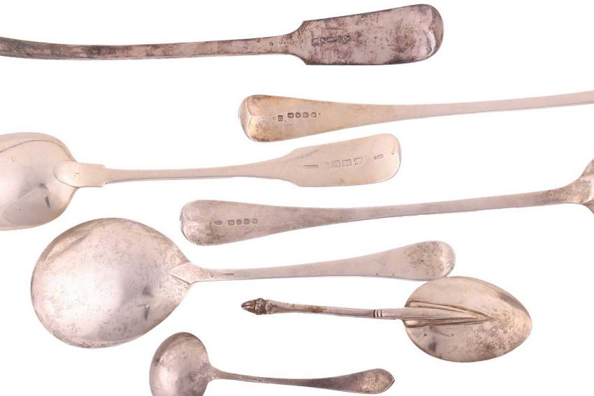 A George III Irish silver fiddle pattern basting spoon, Dublin 1809 by Richard Whitford, retailed by West; together with a George IV Old English pattern basting spoon, London 1823 by William Eley and William Fearn, four further silver and white metal spoons and a silver plated fiddle pattern soup ladle. 14.2ozt, 442 grams wieghable