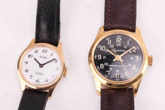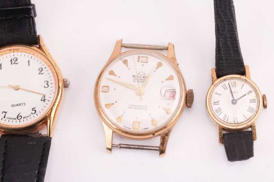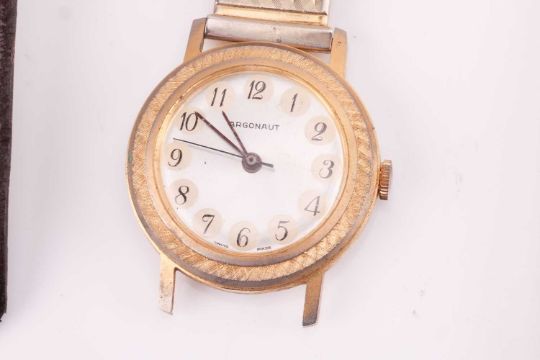 A group of eight gold-plated watches; to include a Buler Antimagnetic watch face, an unsigned quartz watch, an Avia automatic watch, a small Timex quartz watch on a broken strap, an Allaine incabloc watch, a Timemaster quartz watch, a Lucerne automatic watch and an Argonaut antimagnetic watch to a broken strap.