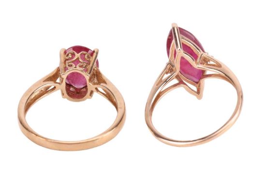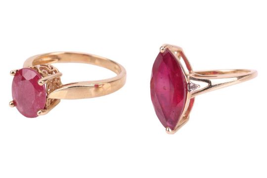 Two rings, the first set with an oval mixed-cut fracture-filled ruby, in a 9ct yellow gold mount, size N1/2, together with a marquise-shaped synthetic ruby ring, with diamond accents, in a 9ct yellow gold mount, size M; 5.6 grams (2)