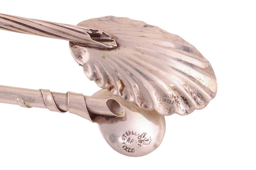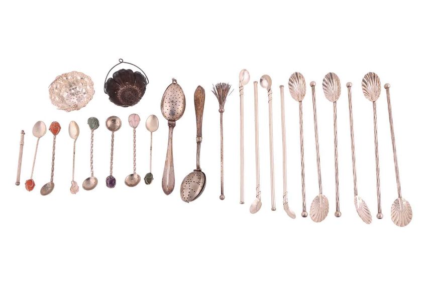 A set of six continental iced tea spoons with shell-shaped bowls, together with a silver tea strainer spoon, a swizzle stick, six teaspoons with gem set terminals and a small quantity of tea related accoutrements. Gross weight 8.6ozt, 269 grams