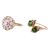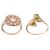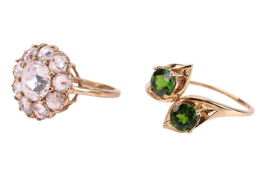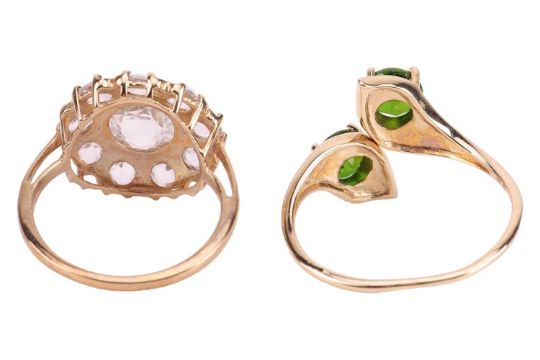 Two gem-set rings in 9ct gold; to include an open crossover ring terminated with two circular-cut chrome diopsides, size S; and a rose-cut colourless to tinted blue zircon cluster ring, size M; total weight of items 5.5 grams. (2)