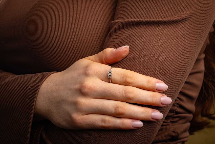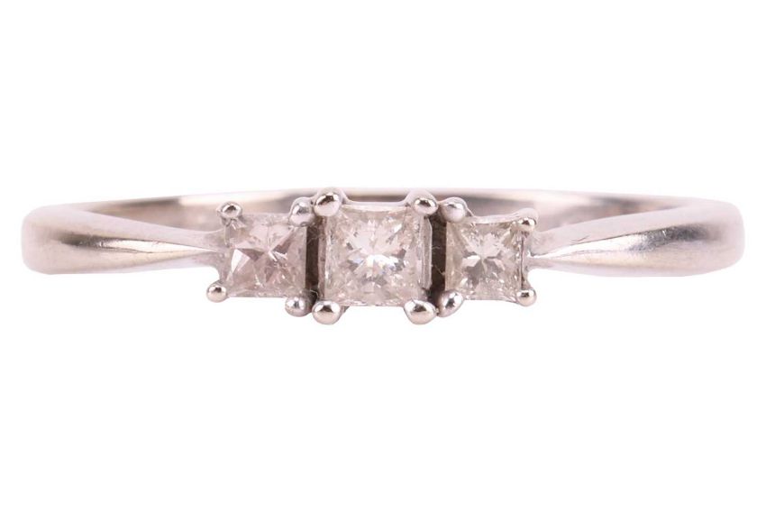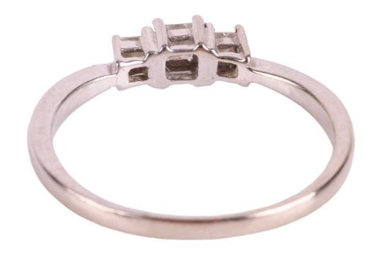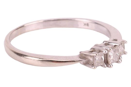 A three-stone diamond ring; claw-set with three graduated princess-cut diamonds, the largest to the centre, approximately 0.40ct total, mounted in 9ct white gold, stamped with partial UK hallmark, maker's mark UT, ring size N 1/2, gross weight 1.54 grams.