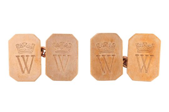 A pair of monogrammed cufflinks in 9ct gold, the octagonal panels each engraved with a crowned ‘W’, with cable link connections, Cropp & Farr sponsor’s marks, British assay marks, in a Collingwood of Conduit Street case, 7.0 grams.