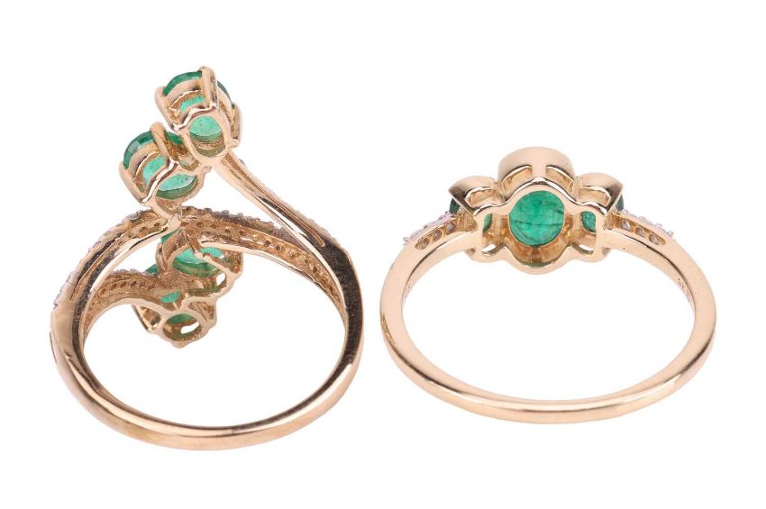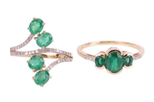 Two emerald-set rings, comprising a three-stone emerald-set ring, with paste-set shoulders, in 9ct yellow gold, size Q, together with an emerald-set spray-style ring in 9ct yellow gold, size L1/2; 4.6 grams (2)