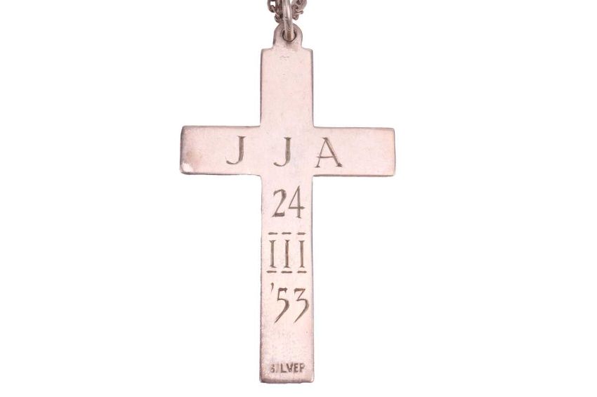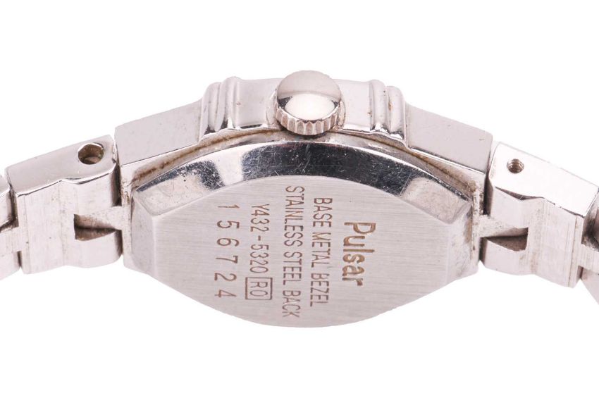 A mixed group of jewellery items comprising a silver oval locket, engraved with scrolling foliate design, to a curb link chain, together with a silver hinged bangle, a white metal cross pendant marked ‘silver’ and a Pulsar wristwatch; total weighable: 105.1 grams (4)