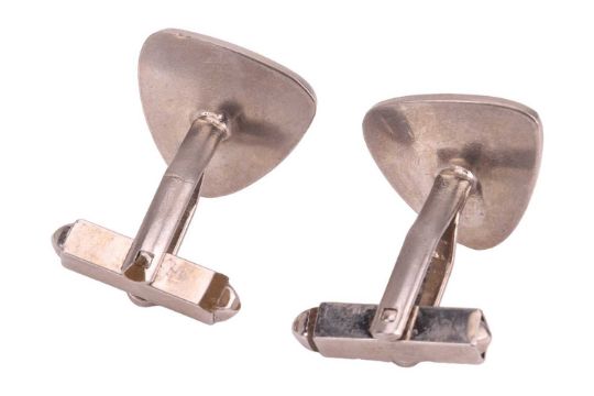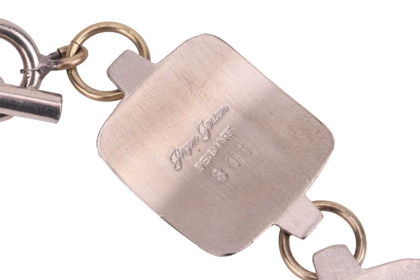 A Jorgen Jensen pewter necklace and bracelet set, comprising concave square links with toggle clasp, design number 311, 43.0 cm and 20.0 cm in length; together with an extra link, and a pair of cased cufflinks in similar design. (3)